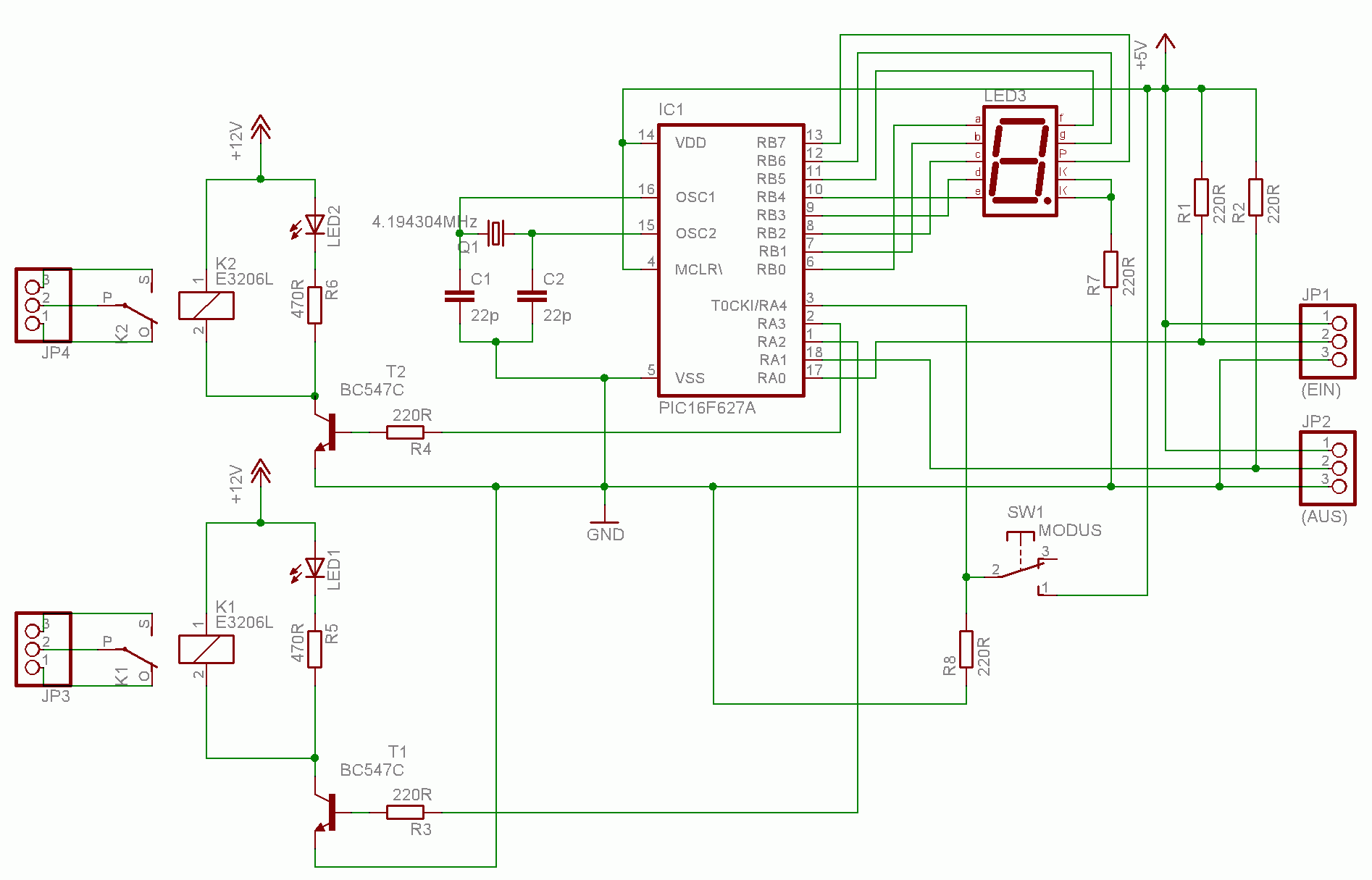 Als Herz der Schaltung wurde der PIC16F627A ausgewählt. Denn obwohl die Aufgabe des PICs relativ einfach ist, liegt der unverkennbare Vorteil darin, dass die Software des PICs stets angepasst werden kann und diese Schaltung somit sehr flexibel arbeiten lässt. Einprogrammiert wurde Folgendes: