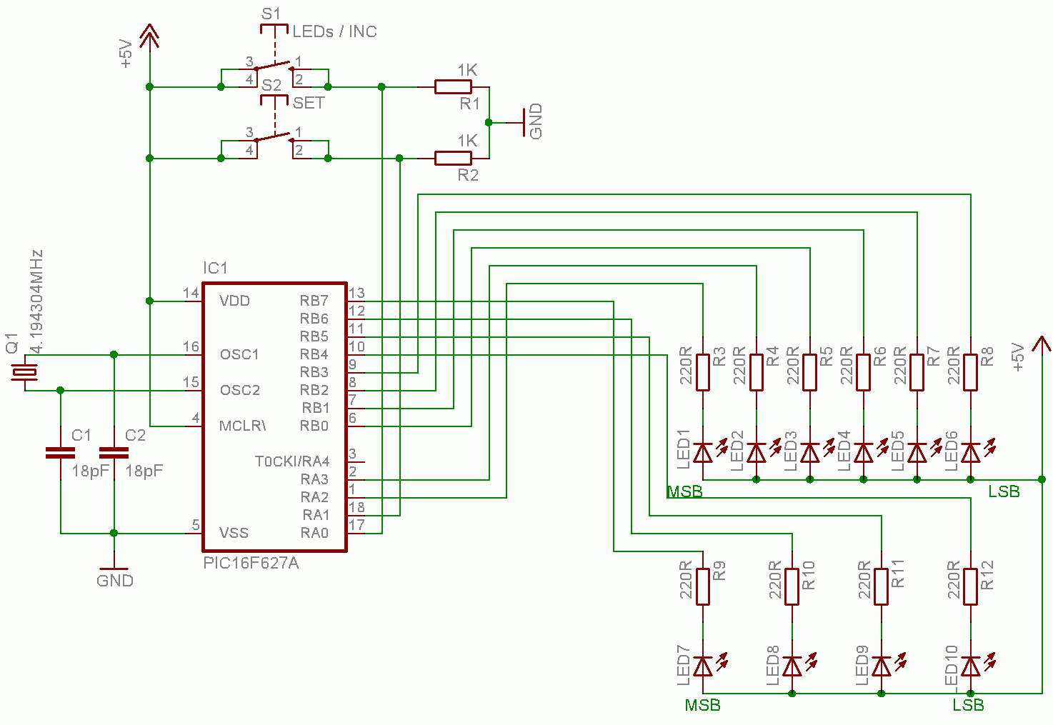 Die Mini-Binäruhr schafft da Abhilfe: die LEDs werden nun direkt über die Ports des PIC16F627A angesteuert (d.h. jede LED hat einen Port, der nichts anderes tut, als sie anzusteuern). Eine Standard-LED braucht ca. 15-20mA an Strom, was die Ausgänge des PIC16F627A aber locker bewerkstelligen können.
