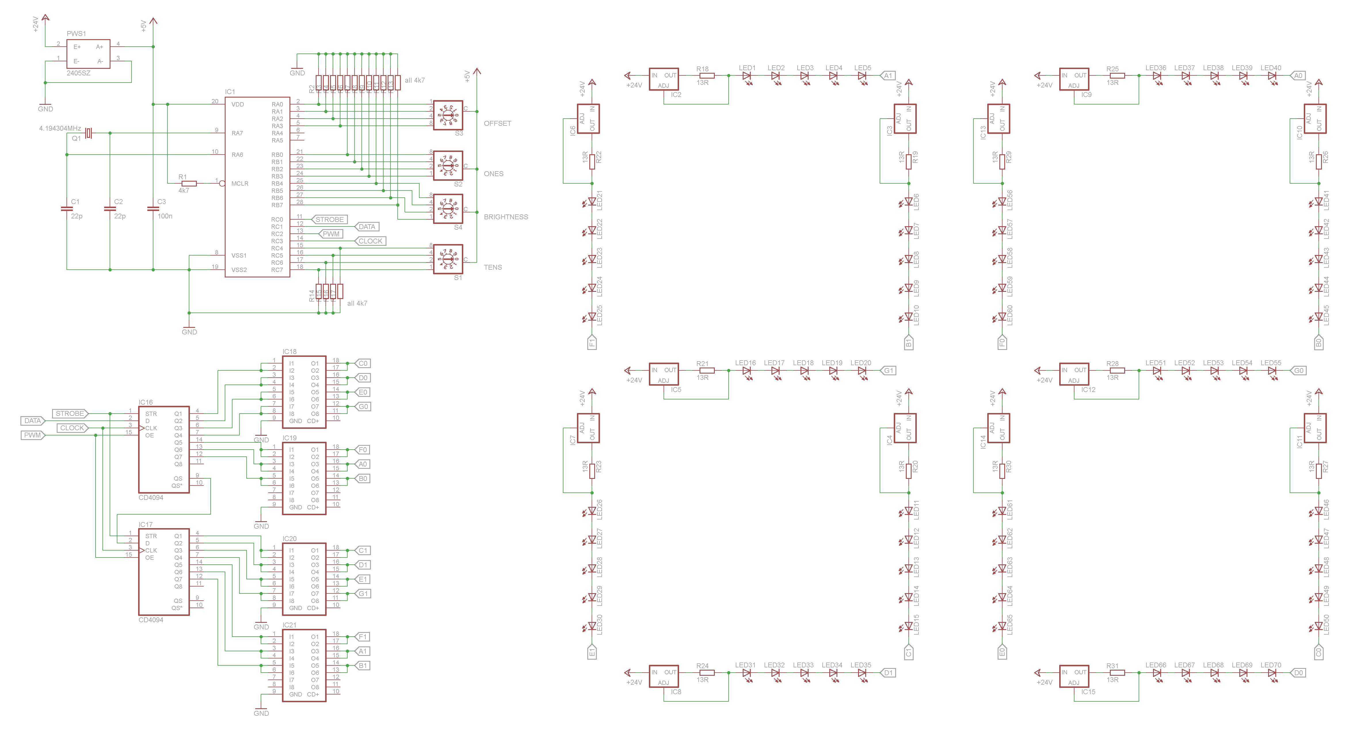 Als Treiber der LED-Segmente kommen wieder die altbewährten ULN2803A zum Einsatz, wobei hier beachtet werden muss, dass ein ULN2803A insgesamt nur maximal 500mA gleichzeitig treiben kann. Also werden pro Ziffer zwei ULN2803A verwendet, und zudem zwei Kanäle parallelgeschaltet.