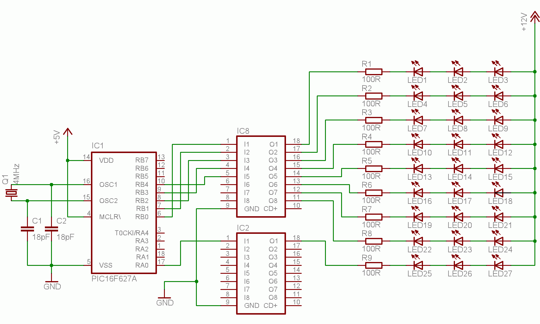 Pro Kanal sind drei LEDs angeschlossen, sodass das eine Gesamtzahl von 27 LEDs ergibt. Drei 10mm-LEDs kann ein PIC-Ausgang nicht ansteuern, als Treiber wurde wieder der altbekannte ULN2803A verwendet, der bis zu 500mA pro Kanal schalten kann. Da sind die 10mm-LEDs mit ihren 30mA bescheidener.