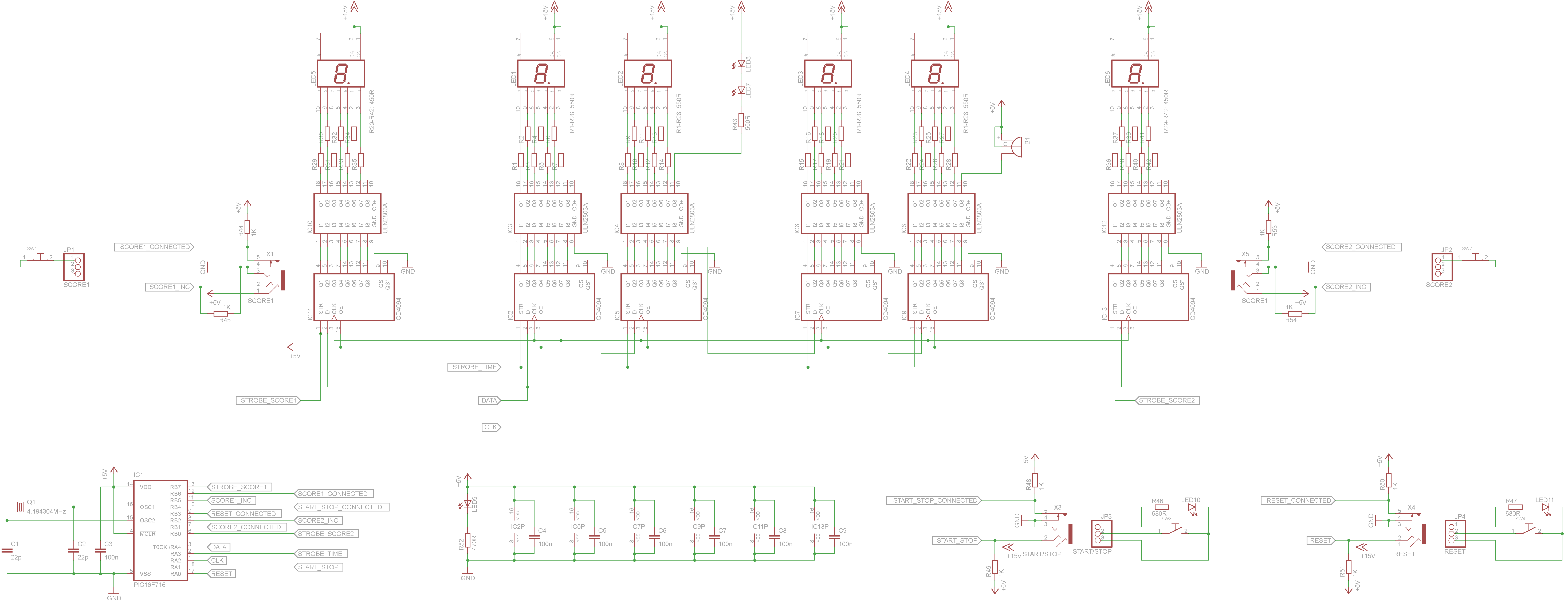 Der gesamte Aufbau ist sehr modular: die Hauptplatine beinhaltet die Spielzeitsanzeige sowie den Controller. Die beiden Spielstandsboards sind separat aufgebaut und werden über Patchkabel mit der Haupt-Platine verbunden. Die Start/Stop-Taster sowie die Buzzer werden über 6,3mm-Klinkenstecker mit der Platine verbunden. Die Darstellung der Aufteilung in Spielstands- und Hauptplatine wurde im Schaltplan unterdrückt, da er schon so recht übersichtlich ist.