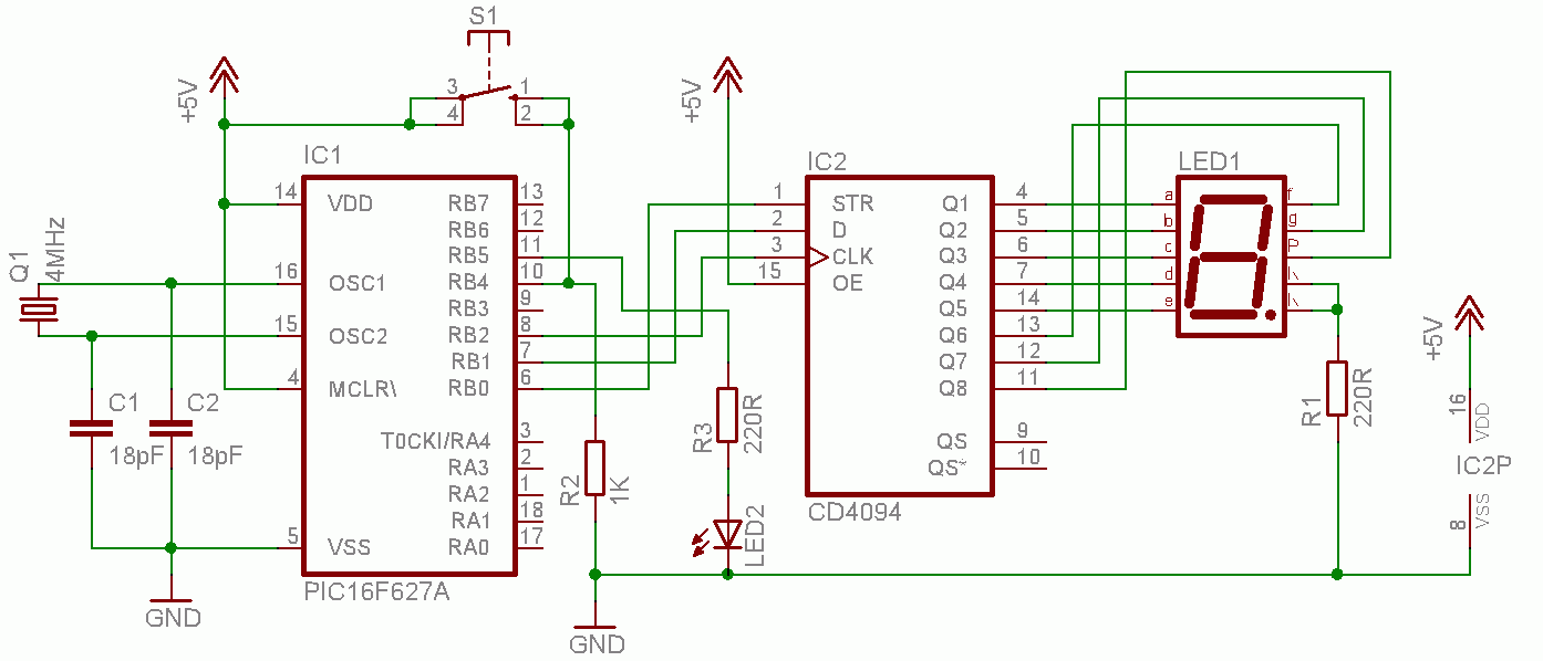 Dieser Zähler leistet im Prinzip genau das selbe wie sein Vorgänger. Um jedoch Ports einzusparen, wie es bei größeren Projekten zwangsläufig geschehen muss, wird nun das 7-Segment-Muster für die Anzeige nicht mehr über den kompletten PORTB ausgegeben; diese Aufgabe wird jetzt von dem Schieberegister CD4094 erledigt. Denn so verwendet man für das Ausgeben der 7-Segment-Daten nur drei Leitungen: die DATA-Leitung zum übertragen des Musters, den CLOCK-Eingang zum Takten und den SROBE-Eingang zum Übertragen des aktuellen Wertes im Register an die Ausgänge. Siehe dazu auch den Artikel Pins einsparen.