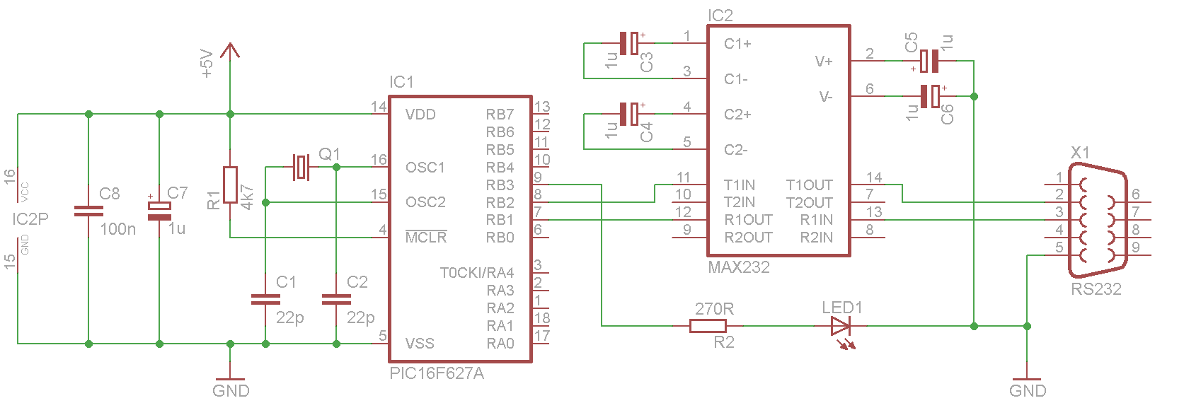 Zum einen benötigen wir natürlich einen Mikrocontroller, wobei ich mich hier natürlich für einen PIC entscheide: der PIC16F627A wird verwendet. Es kann natürlich auch jeder andere mit einem USART- oder UART-Modul verwendet werden.