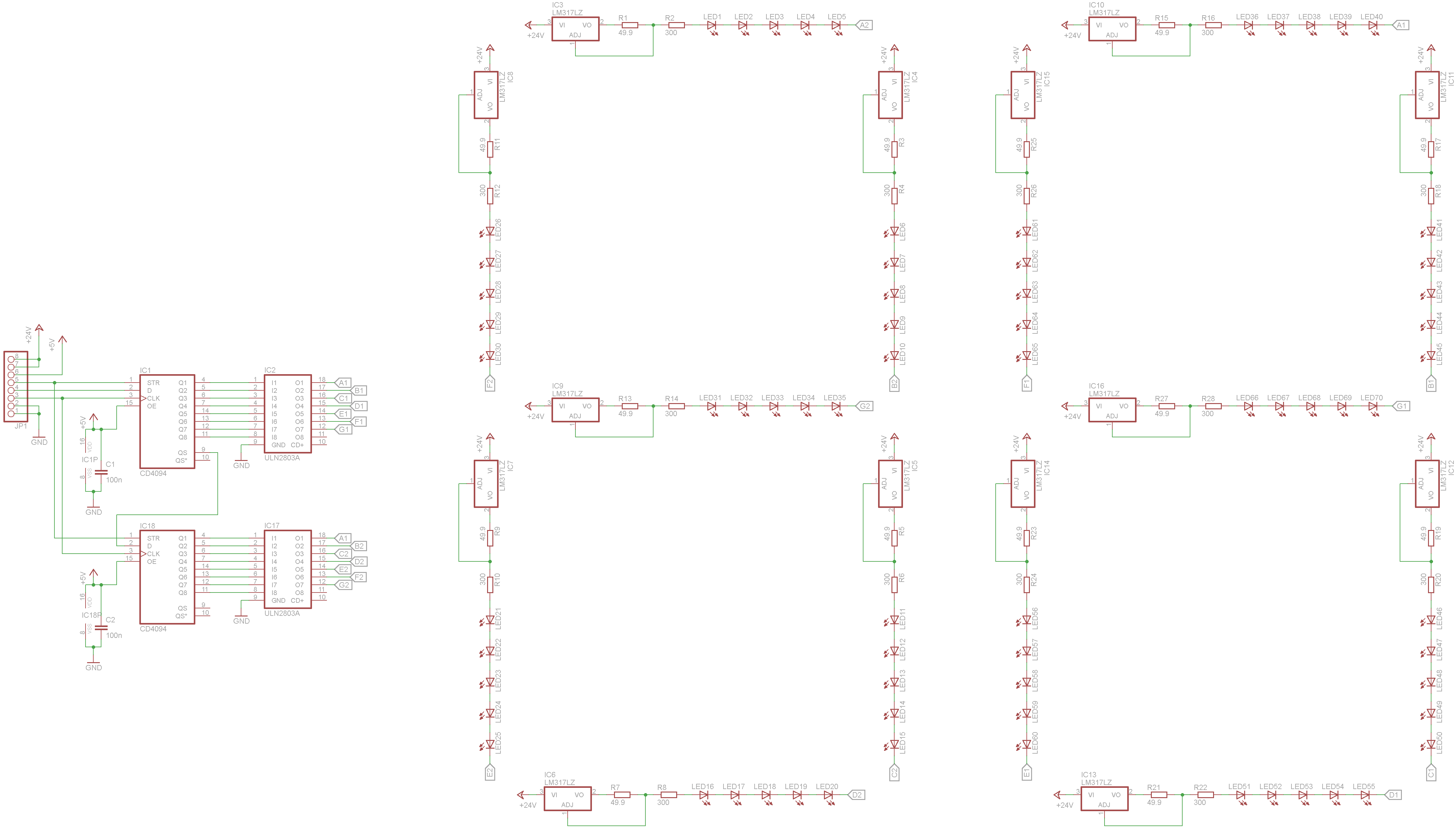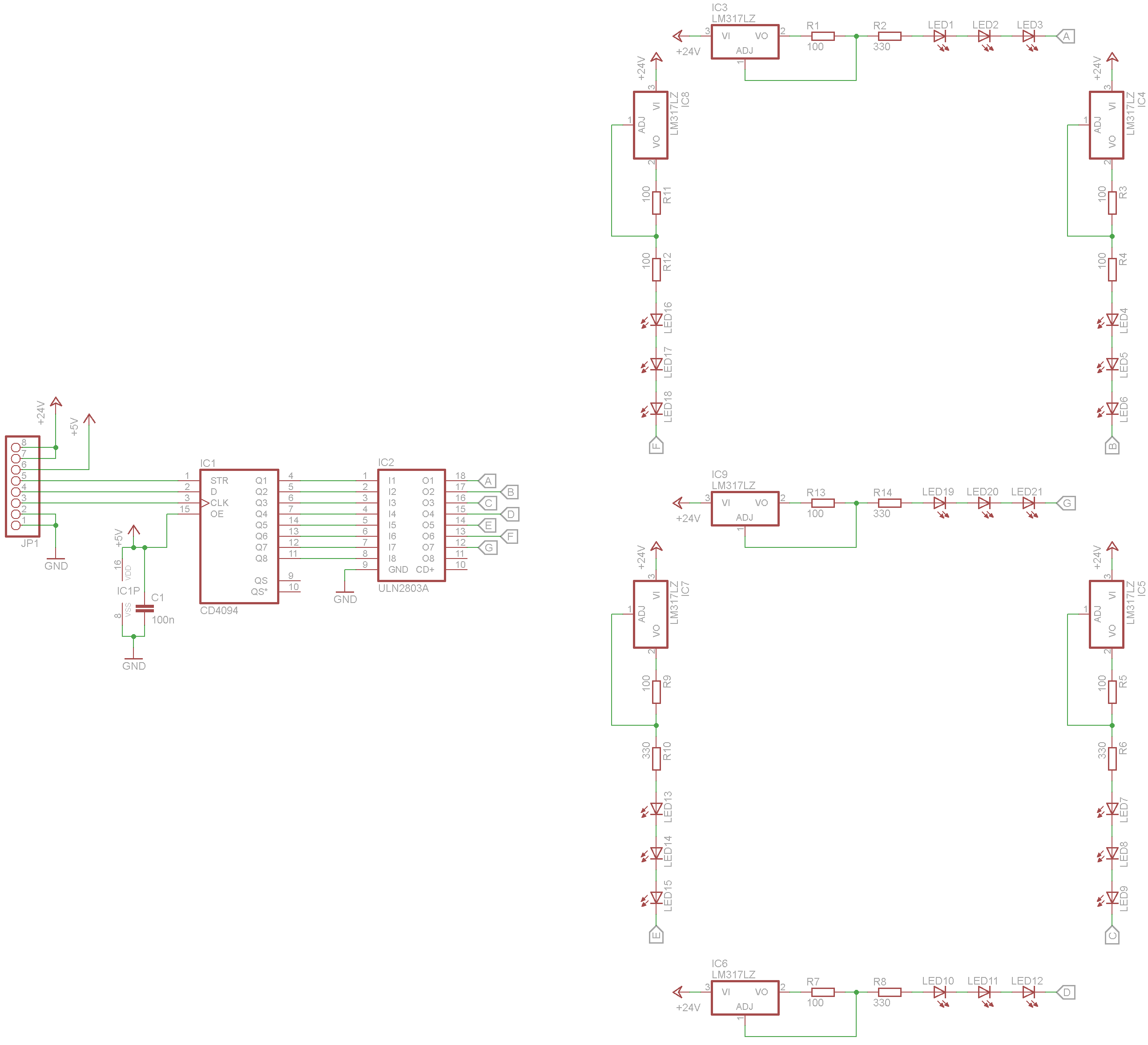 Angesteuert werden die LEDs über CD4094-Schieberegister und ULN2803A-Darlington-Arrays. Der Strom für die LEDs wird pro Segment von der bewährten LM317-Konstantstromquelle bereitgestellt: