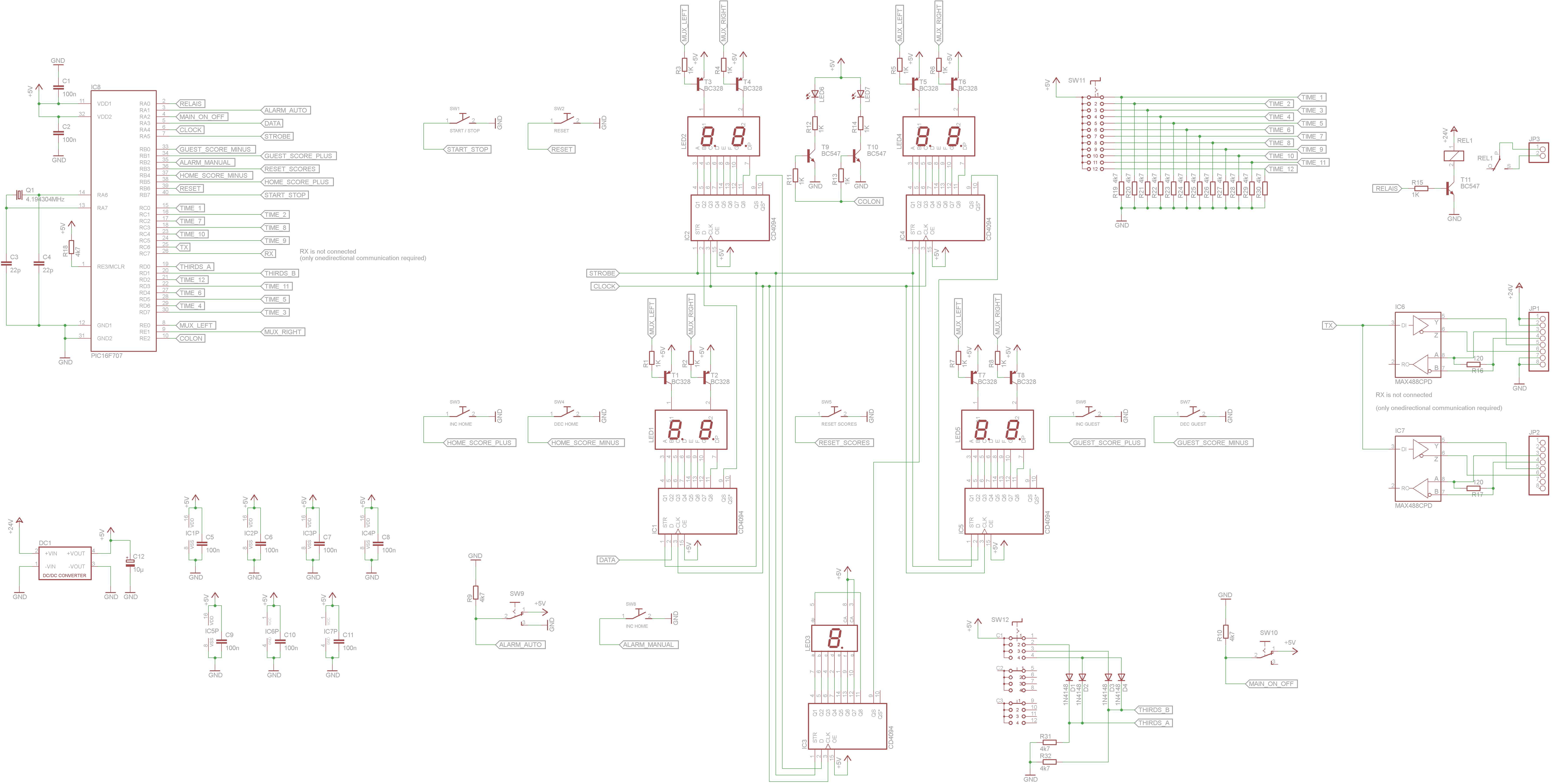 Ein Gesamtdisplay besteht hier aus dem Zeitboard, den beiden Spielstandsboards und dem Drittelboard. Das Zeitboard bildet die Hauptplatine, auf ihr ist der Mikrocontroller PIC16F627A untergebracht, der die Daten der Fernbedienung empfängt und an die Anzeigen weiterleitet.