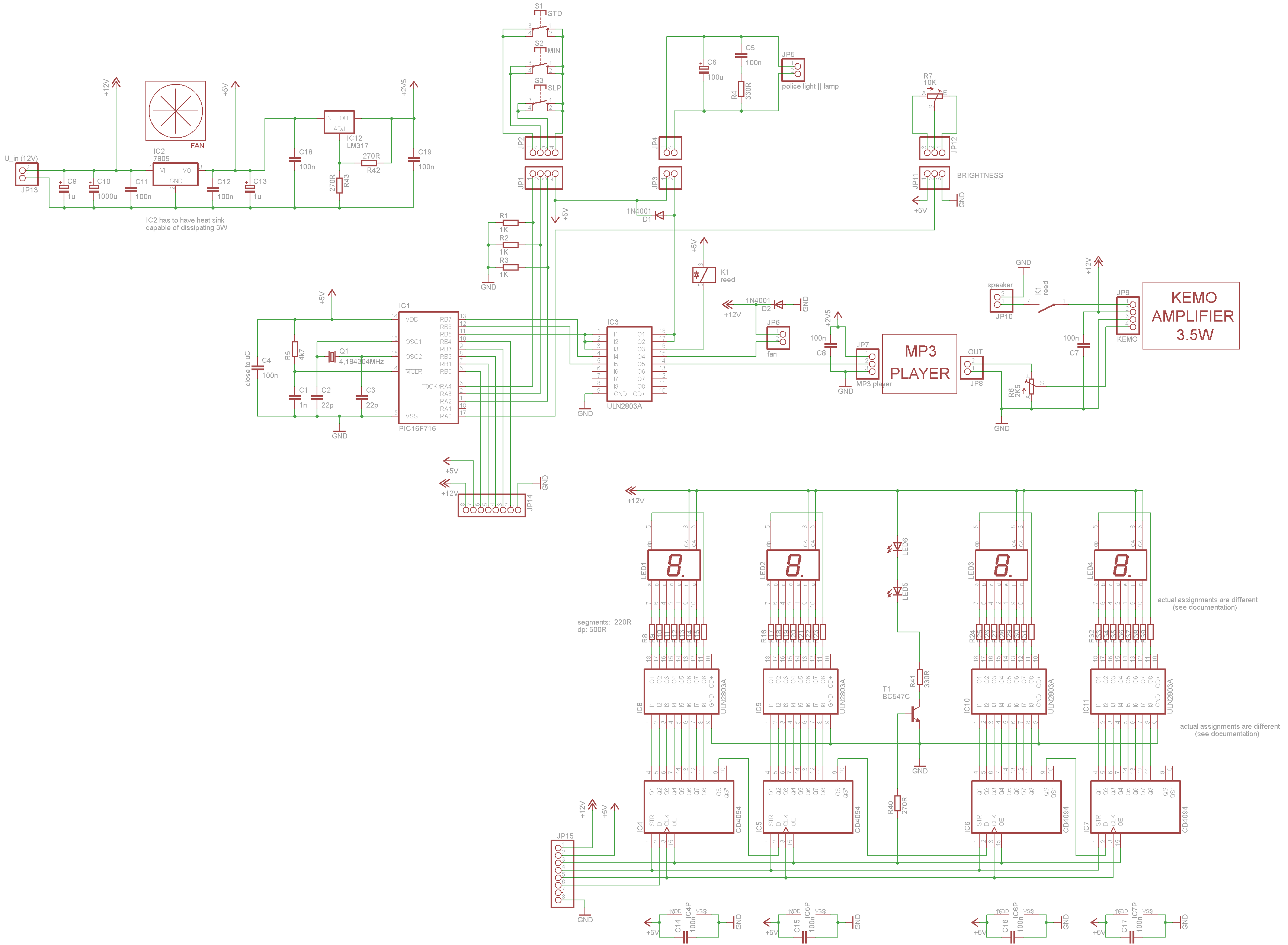 Dieser Schaltplan ist der zweite Anlauf des Projektes; die Rundumleuchte hat starke Probleme verursacht, da deren Motor die Schaltung erheblich störte. Wichtig beim Nachbau ist, dass die Zuleitung zur Rundumleuchte weit weg vom Controller angebracht wird. Zudem sollten ebenso die Pufferkondensatoren nicht weggelassen werden. Die Freilaufdioden bei induktiven Lasten wie dem Lüfter und der Rundumleuchte sind ebenfalls Pflicht. Mensch hätte noch dem Motor einen eigenen 7805-Regler verpassen können, um die Controller-Versorgungsspannung von der des Motors zu enkoppeln, aber im obigen Setup läuft die Schaltung bei mir schon stabil. Es ist jedoch immer eine gute Idee, Steuer- und Lastkreise zu trennen bzw. mittels Dioden etwas zu entkoppeln, für die nächsten Projekte werde ich mir das merken.