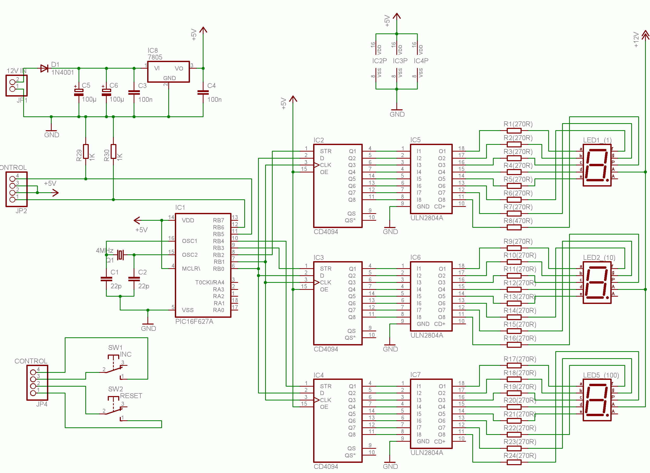 Der entscheidende Vorteil des Digitalzähler IV ist jedoch, dass hier ein PIC verwendet wird - sicher, die Verwendung eines PICs für einen einfachen Digitalzähler erscheint vielen als eine Art von "Mit Kanonen auf Spatzen schießen" - aber der PIC ermöglicht eine flexible Benutzung des Moduls. Beispielsweise kann der Zählerstand automatisch und flexibel bei einem bestimmten Stand automatisch resettet werden, die Schrittweite des Zählers ist flexibel einstellbar, und so weiter und so fort.