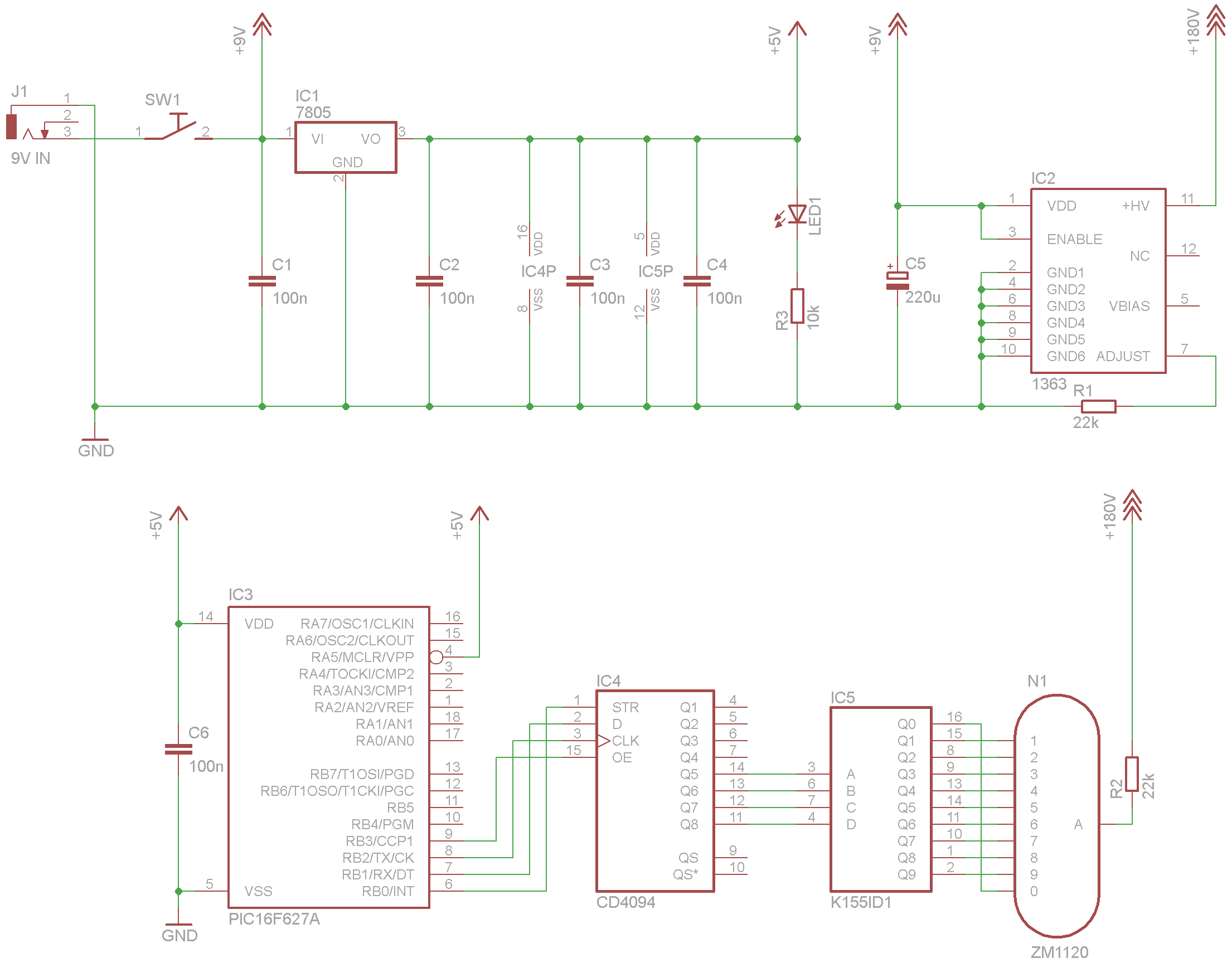 The electronics are very simple; the input voltage is 9V, a high voltage module converts them into +180V for the ZM1120, and a 7805 creates 5V out of the 9V for the controller and periphery. That is, a CD4094 latch and a K155ID1 driving the Nixie tube. Behind the Nixie tube I mounted an orange 3mm LED which glows permanently. The OE pin of the CD4094 is used to dim the Nixie tube display and thereby spares us the use of a high voltage anode driver.