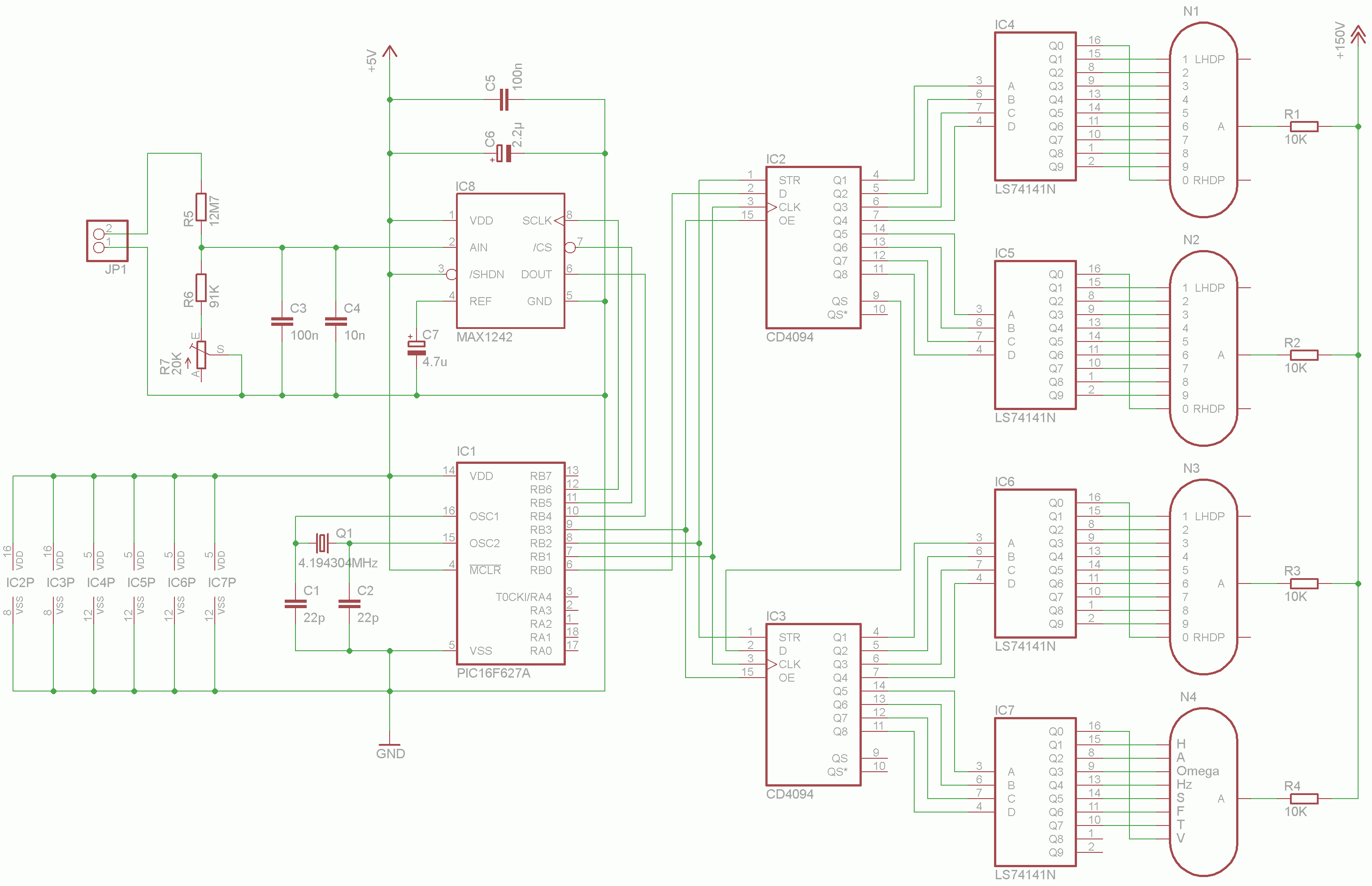 Das Herz der Schaltung ist der PIC16F627A, der die beiden Schieberegister ansteuert, die wiederum jeweils zwei BCD zu Dezimal-Dekoder ansteuern, die aber auch gleichzeitig Hochspannungstreiber sind.
